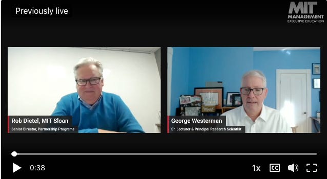 Watch the Webinar discussion and Q&A on leading AI-powered transformation with George Westerman, Principal Research Scientist and Senior Lecturer in Information Technology. George and his colleagues pioneered the study of digital transformation. Now they can show you how to transform in today’s fast-moving world of intelligent machines continuously.”